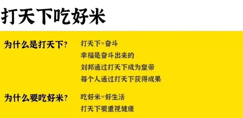 廣勤+打天下吃好米:既有打天下的大刀闊斧,筆劃中的撇似刀一樣,又有圓潤(rùn)柔和的一面