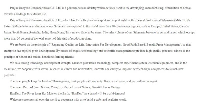 盤錦天源藥業(yè)有限公司是中國最大的水飛薊提取物生產(chǎn)和出口的企業(yè)。以水飛薊素為主導(dǎo)產(chǎn)品的具備國家藥品GMP認證資格的綜合性高新技術(shù)制藥企業(yè)。主要從事天然植物提取、中藥材加工和外用藥制劑的生產(chǎn)、銷售。公司產(chǎn)品遠銷到歐共體、美國、日本、韓國、澳大利亞、印度、香港、臺灣等二十幾個國家和地區(qū),深受用戶青睞。