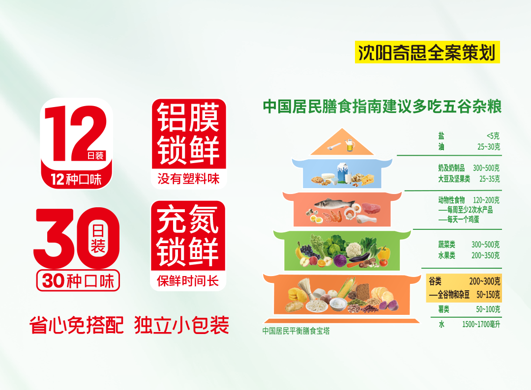 鋁膜鎖鮮:沒有塑料味充氮鎖鮮:保鮮時(shí)間長(zhǎng)省心免搭配 獨(dú)立小包裝中國(guó)居民膳食指南:建議多吃五谷雜糧